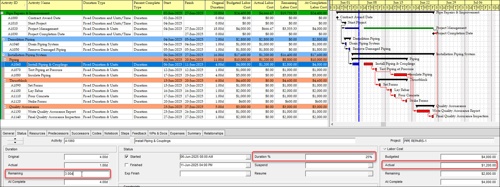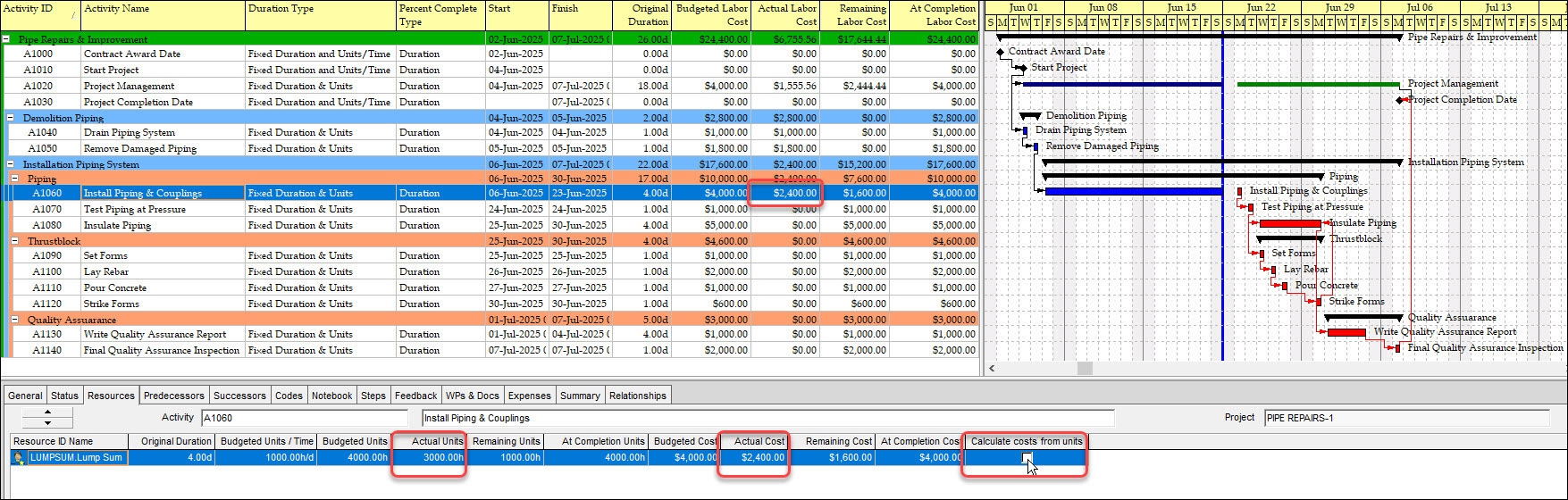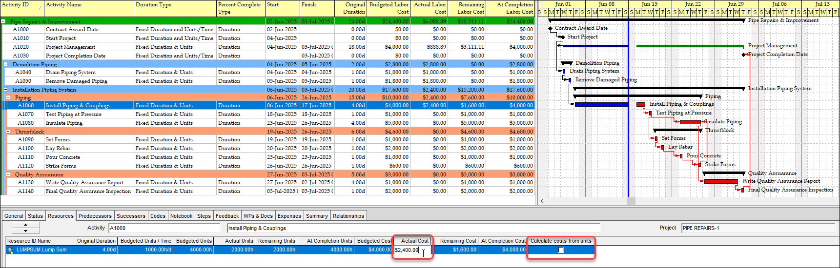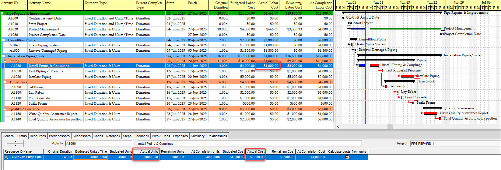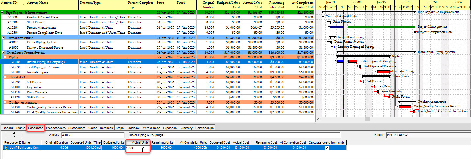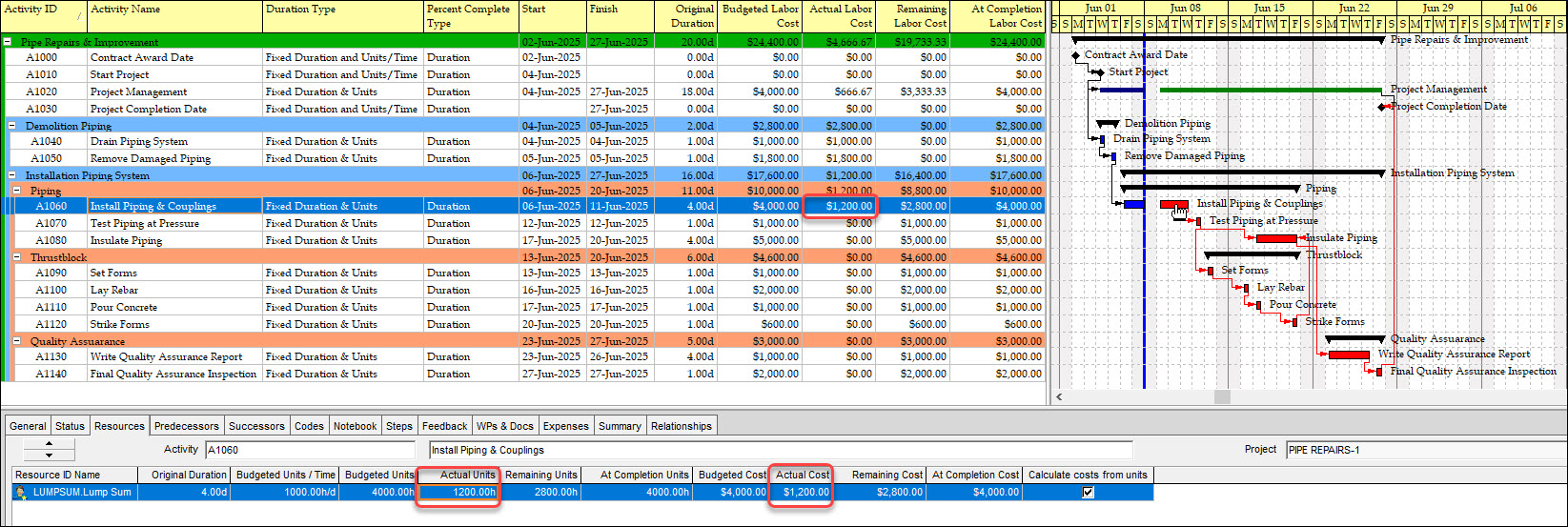 در این مثال، پیشرفت نسبت به هزینه بهصورت غیرخطی اتفاق افتاده است؛ بهطوری که برای یک روز فعالیت "نصب لوله و اتصالات"، ۱۲۰۰ واحد از منبع مصرف شده است، نه ۱۰۰۰ واحد. در شکل 6، مقدار ۱۲۰۰ واحد بهعنوان منبع واقعی برای روز اول وارد شده و در نتیجه، هزینه واقعی معادل در شکل 7 برابر با ۱,۲۰۰ دلار محاسبه شده است (در این مقاله محاسبههای هزینه واقعی (Actual Cost) در Primavera P6 آموزش داده شده است).
