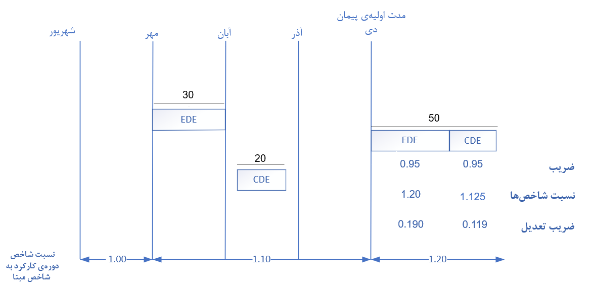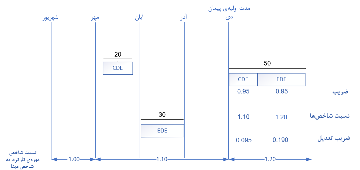 - نسبت شاخص دوره به شاخص مبنا به ترتیب برای دورههای دوم و سوم و چهارم سال برابر با 1 و 1.1 و 1.2 در نظر گرفته شده است.