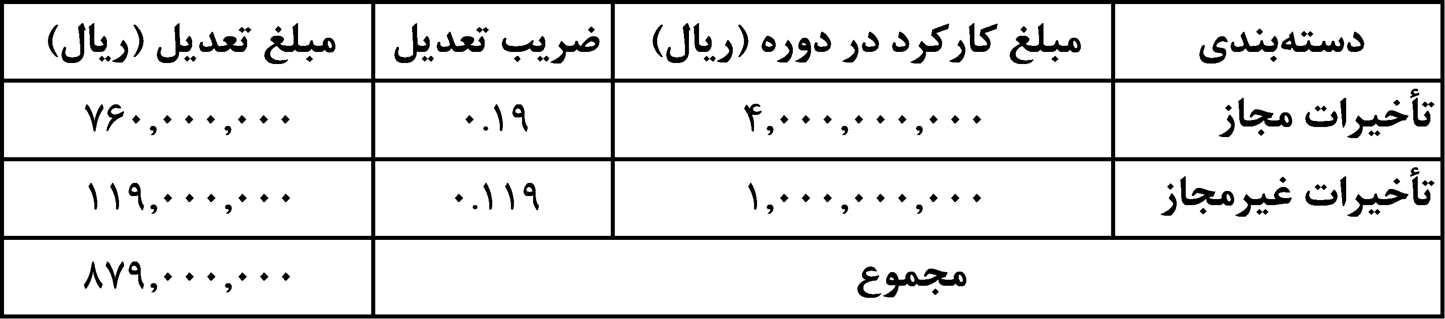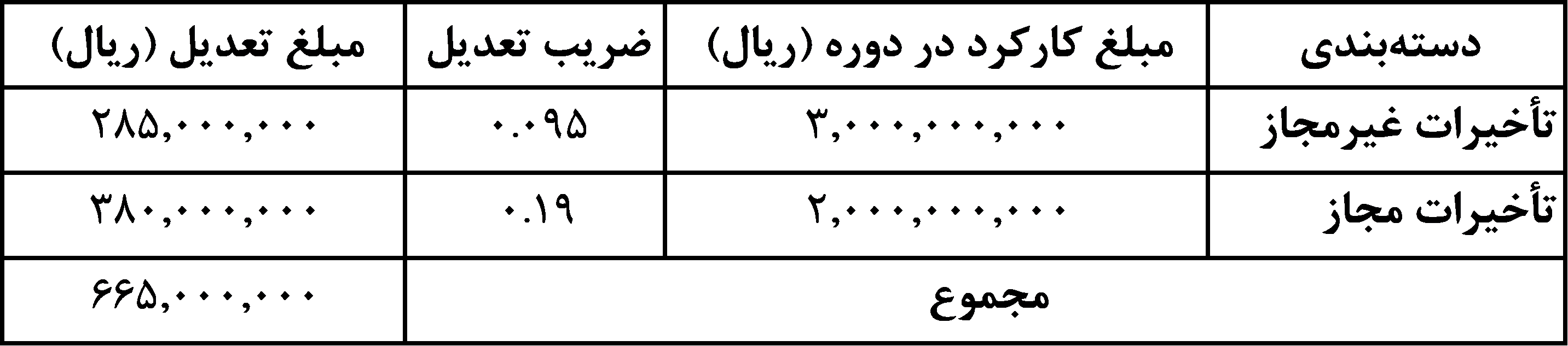 در جدول محاسبات، ضرایب تعدیل متفاوتی برای تأخیرات مجاز و غیرمجاز لحاظ شده است که نشاندهندهی اثر تقدم تأخیرات بر میزان تعدیل است.