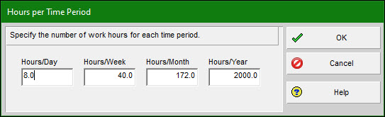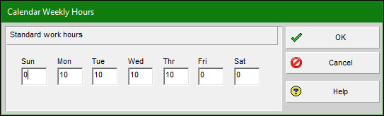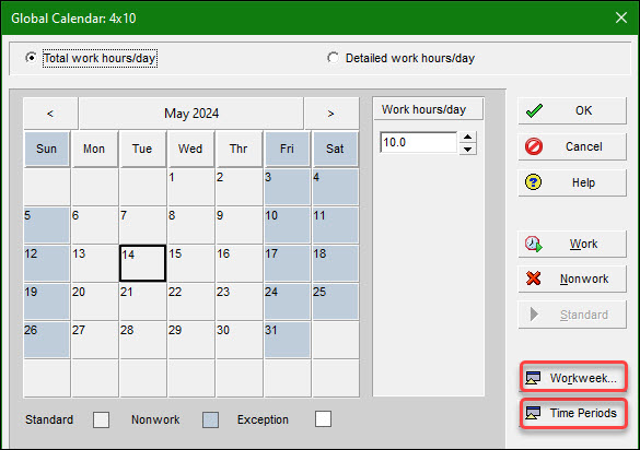 هفته کاری نشاندادهشده در شکل ۳ از طریق کلیک بر روی دکمه Workweek در پنجره Global Calendar (شکل ۴) تنظیم میشود. با این حال، صرفاً تعریف هفته کاری کافی نیست و لازم است تنظیمات Hours per Time Period نیز انجام شود. این کار با کلیک بر روی دکمه Time Periods در شکل ۴ انجام میگیرد. پس از آن، پنجره تنظیمات Hours per Time Period مطابق با شکل ۵ نمایش داده میشود.