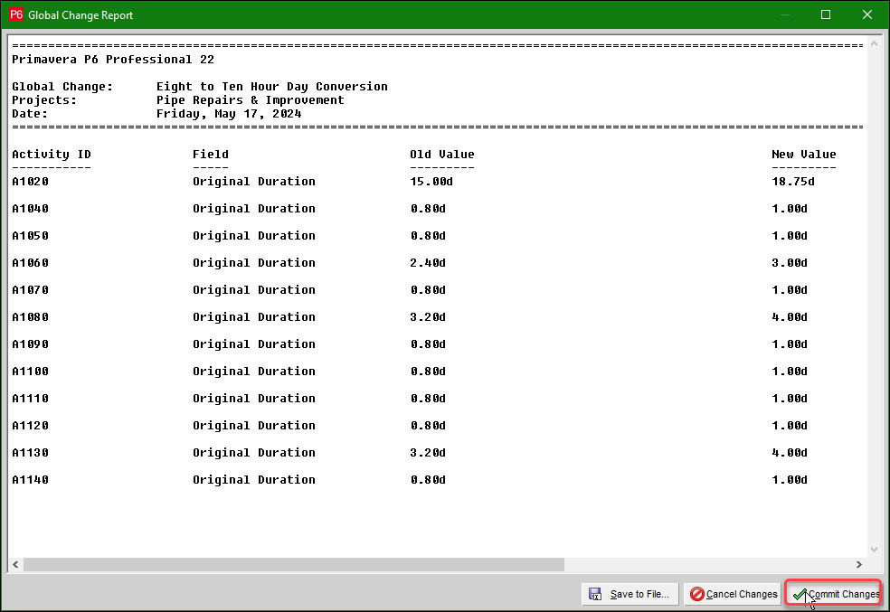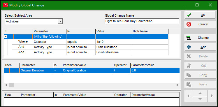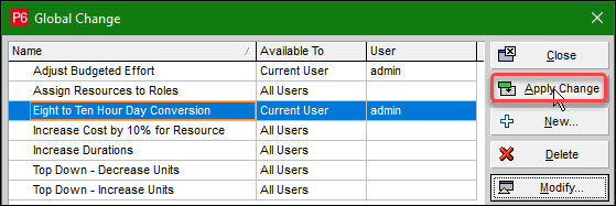 برای خودکارسازی این فرایند، از روال تغییرات سراسری (Global Change) بر روی فعالیتها استفاده میشود. روال تغییرات سراسری برای تبدیل مدتهای اولیه به شکل زیر انجام میشود.