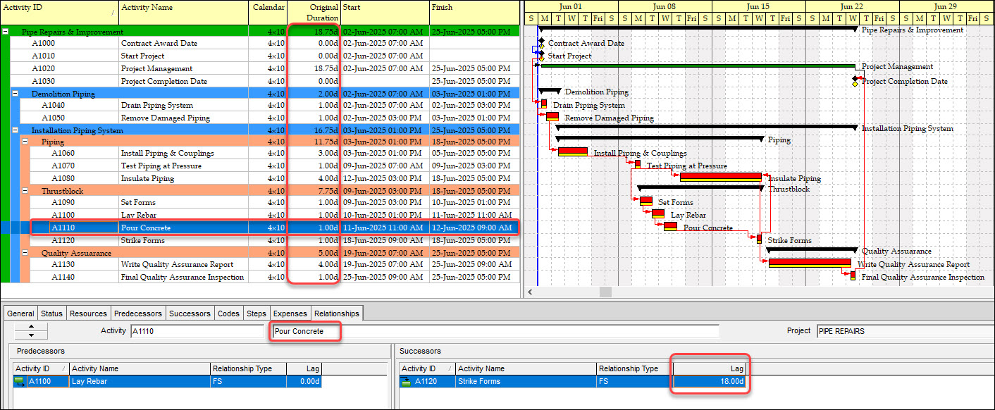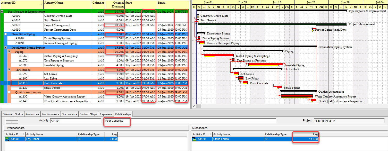 مدت فعالیت پشتیبان پروژه (LOE) نیز بهصورت کسری ثبت شده است. این موضوع به این دلیل رخ داده است که پس از تغییر مدتها، نیاز به بازمحاسبهی برنامه زمانبندی وجود داشت. در شکل ۱۲، برنامه زمانبندی بازمحاسبه شد (در این مقاله به نمایش Baseline فعالیتهای LOE در نرمافزار Primavera P6 پرداخته شده است).