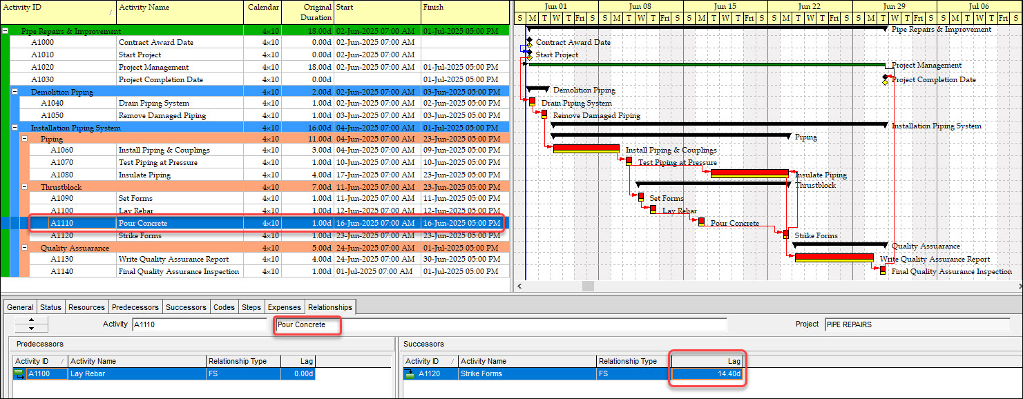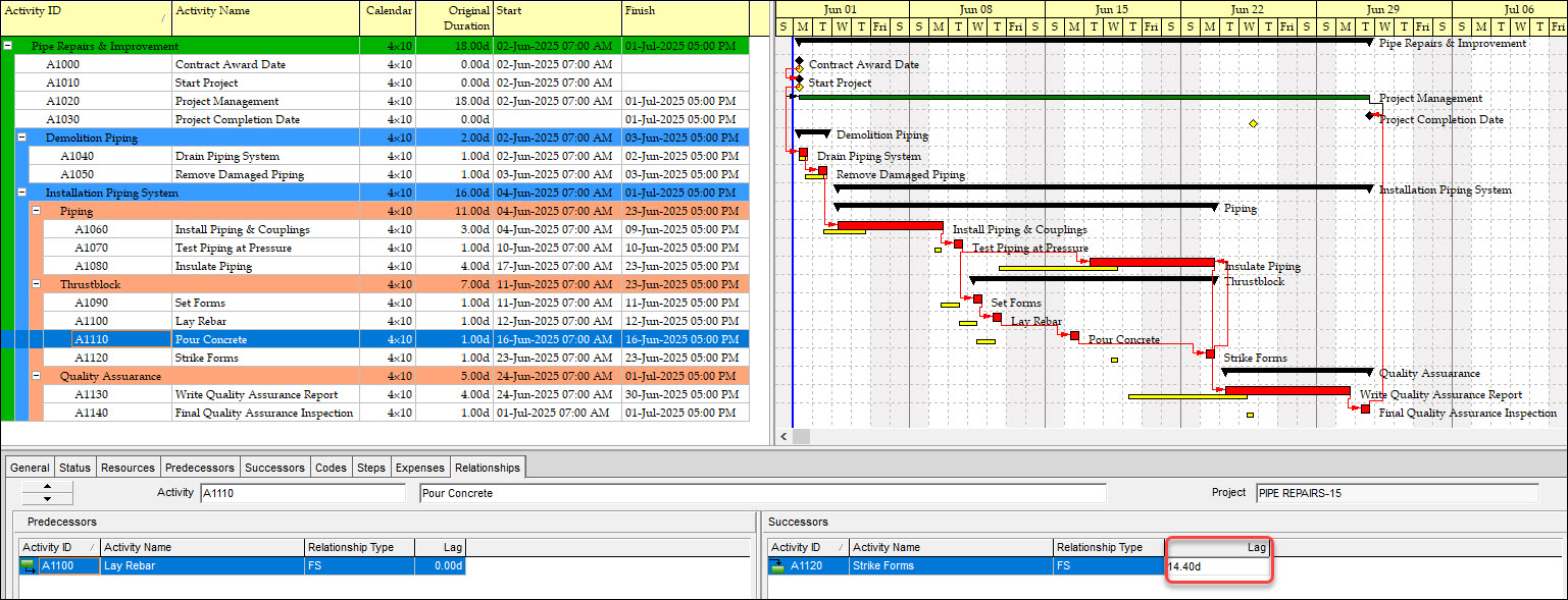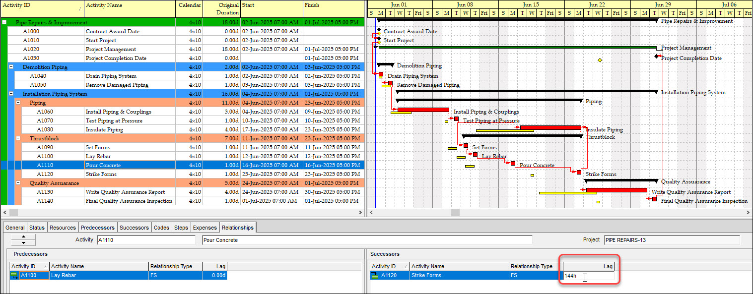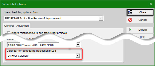 P6 تاخیر تقویم ۲۴ ساعته را بر حسب روز نمایش میدهد که این موضوع میتواند گمراهکننده باشد. با توجه به تنظیم Hours per Day برابر ۱۰ ساعت، هر دورهی ۱۰ساعته معادل یک روز است، بنابراین در ۲۴ ساعت، این مقدار برابر با ۲.۴ روز خواهد بود. برای داشتن یک تأخیر ششروزه، عدد ۲.۴ روز در شش ضرب میشود. نتیجهی محاسبه، ۱۴.۴ روز برای تاخیر است که با مقدار تاخیر پس از اجرای روال Global Change مطابقت دارد. همچنین میتوان صحت تعداد روزهای تاخیر را با وارد کردن آن بر حسب ساعت تأیید کرد. برای تاخیر ششروزه، شش ضربدر ۲۴ ساعت برابر با ۱۴۴ ساعت میشود. در شکل ۱۵، مقدار ۱۴۴ ساعت برای تاخیر وارد شده است.