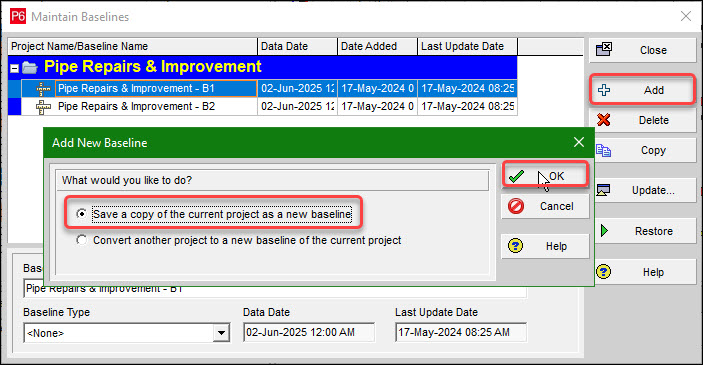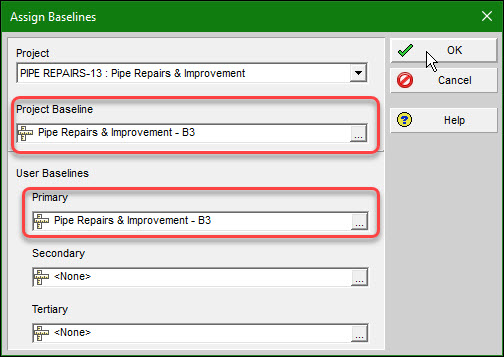 این نسخه بهعنوان Baseline برای پروژهی Pipe Repairs and Improvement—B3 تعیین شد. در پنجرهی Assign Baselines ،Baseline B3 بهعنوان Project Baseline و Primary Baseline اختصاص داده شد.
