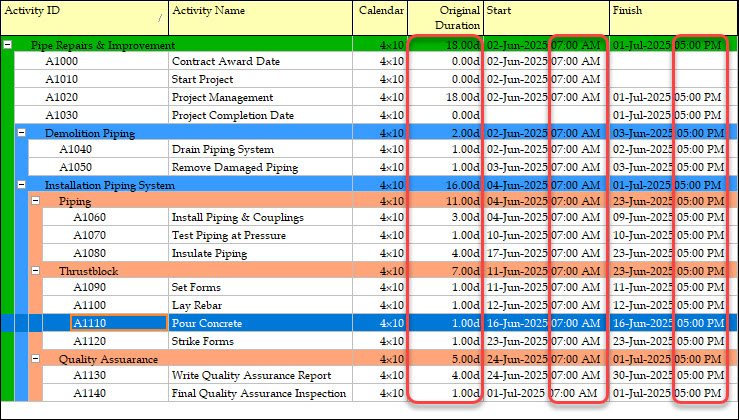 تنظیم ساعات هفتگی شروع خوبی است، اما باید Hours per Time Period نیز مشخص شود تا با آن مطابقت داشته باشد، در غیر این صورت مدت فعالیتها و تحویلدادنیها در جدول فعالیتها نادرست خواهند بود. اگر هفته کاری برنامه شما شامل روزهای ۱۰ساعته است، Time Period Hours per Day باید ۱۰ ساعت باشد تا هر بازهی ۱۰ساعته معادل یک روز در نظر گرفته شود و نه ۱.۲۵ روز. در صورتی که به اشتباه Time Period Hours per Day روز ۱۰ساعته را ۸ ساعت تنظیم کرده و سپس آن را به ۱۰ ساعت اصلاح کنید، P6 Professional مدتها را در ۰.۸ ضرب میکند تا جبران شود. اگر در ابتدا تصور میشد که روزهای ۱۰ساعته تعریف شدهاند، برای اصلاح مدتها، باید آنها را بر ۰.۸ تقسیم کرد که این کار بهطور کارآمد با استفاده از روال Global Change قابل محاسبه است. اگر این مراحل بهدرستی انجام شود، مدت فعالیتهای کامل روز به مدت تحویلدادنیهای کامل روز معادل میشود و تاریخهای ثبتشده با مدت کامل روز مطابقت خواهند داشت. در مثال ما، روز کاری ۱۰ساعته از ساعت ۷ صبح آغاز و در ساعت ۵ بعدازظهر پایان یافت (در این مقاله به راهنمای گامبهگام برای کسب بیشترین تخصص در Primavera P6 پرداخته شده است).