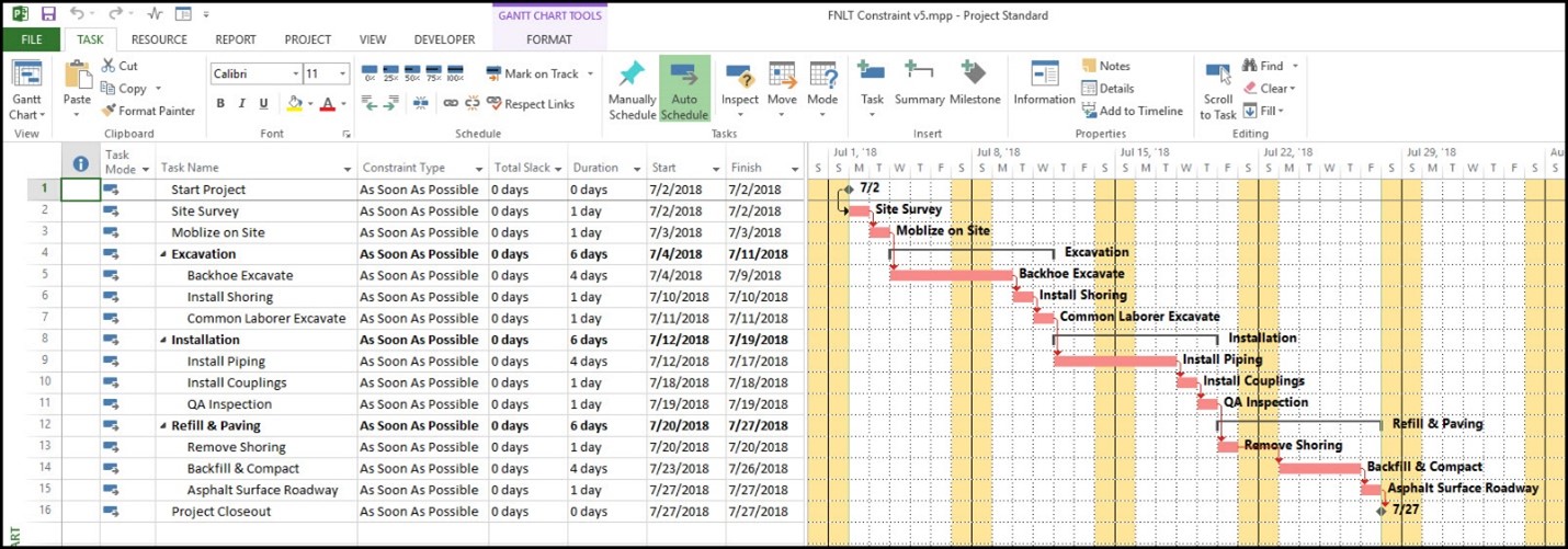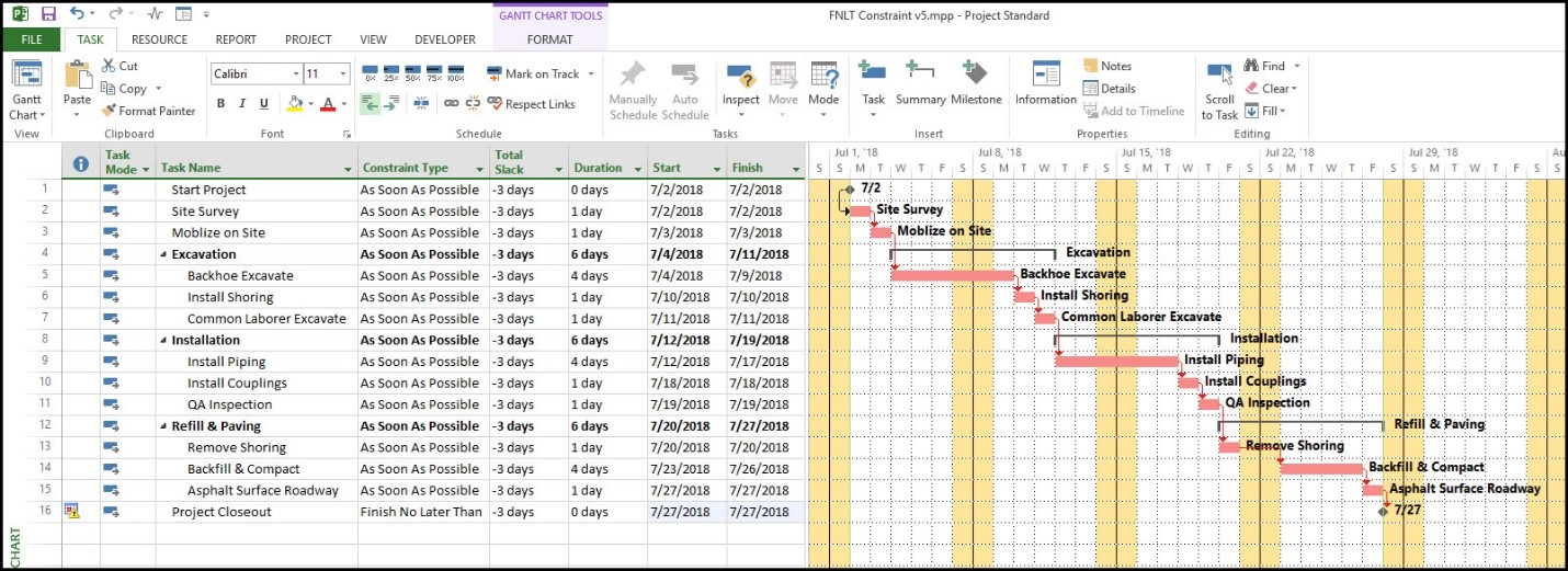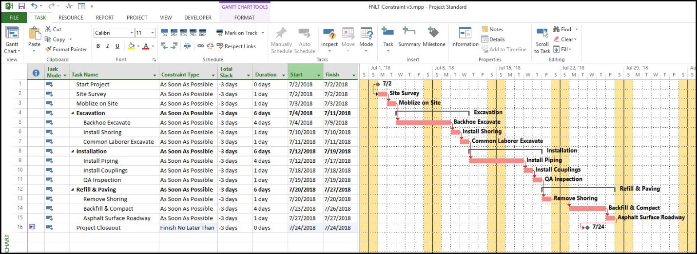 در شکل ۱، یک برنامهزمانبندی نمونه برای پروژه اجرای سیستم لولهکشی زیرزمینی نشاندادهشده است. در قرارداد این پروژه ذکر شده است که این پروژه باید تا تاریخ ۲۴ ژوئیه ۲۰۱۸ (24-07-2018) تحویل داده شود؛ بنابراین، برنامهزمانبندی به قید FNLT برای رخداد کلیدی پایان پروژه (project closeout milestone) نیاز دارد که تاریخ تعهد تحویل پروژه است.