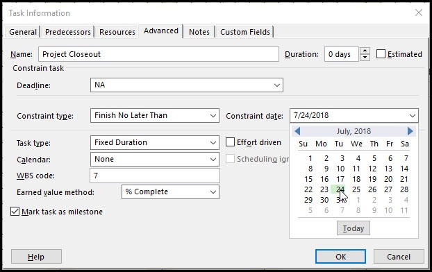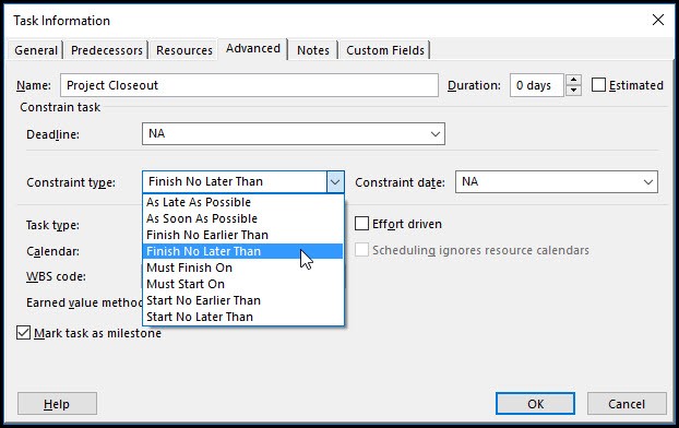 برای افزودن قید FNLT در جدول فعالیتها، رخداد کلیدی پایان پروژه را تعیین، سپس از تب Task، گروه Properties، آیکون Information انتخاب شود. در کادر Task Information، تب Advanced را انتخاب و از منوی کشویی نوع قید، گزینه Finish No Later Than انتخاب شود (شکل ۲).