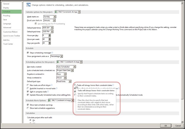 بهترین رویکرد در مدیریت پروژه این است که تاریخهای اتمام فعالیتها بر اساس مدتزمان آنها و منطق شبکه تعیین شوند. بااینحال، گاهی قیدهای خارجی مانند تاریخ تحویل مشخصشده در قرارداد، برنامه زمانبندی را تحتتاثیر قرار میدهند. برای مدلسازی این تاریخها، استفاده از قید Finish No Later Than (FNLT) (عدم پایان دیرتر از تاریخ مشخص) مناسب است تا تاثیر آنها در جدول فعالیتها نمایش داده شود. بااینوجود، باید از نقض منطق شبکهای در نمودار گانت (Gantt Chart) جلوگیری کرد، زیرا این امر میتواند باعث سردرگمی درباره تاریخهای واقعی و قابلدستیابی پروژه شود. برای این منظور، باید گزینه «Tasks will always honor their constraint dates» (فعالیتها همیشه تاریخهای قید خود را رعایت میکنند) را غیرفعال کرد. این کار به مقادیر شناوری کل (total float) اجازه میدهد تا هشدار دهند که پروژه در معرض خطر عدم رعایت مهلتهای زمانی قرار دارد. قیدها باید با احتیاط و تنها برای تاریخهای قراردادی یا قیدهای خارجی به کار روند. همچنین، مستندسازی هر قید برای شفافسازی دلیل و منطق آنها ضروری است (برای آشنایی بیشتر با Microsoft Project به مقاله راهنمای گامبهگام برای کسب بیشترین تخصص در (Microsoft Project - MSP) مراجعه کنید).