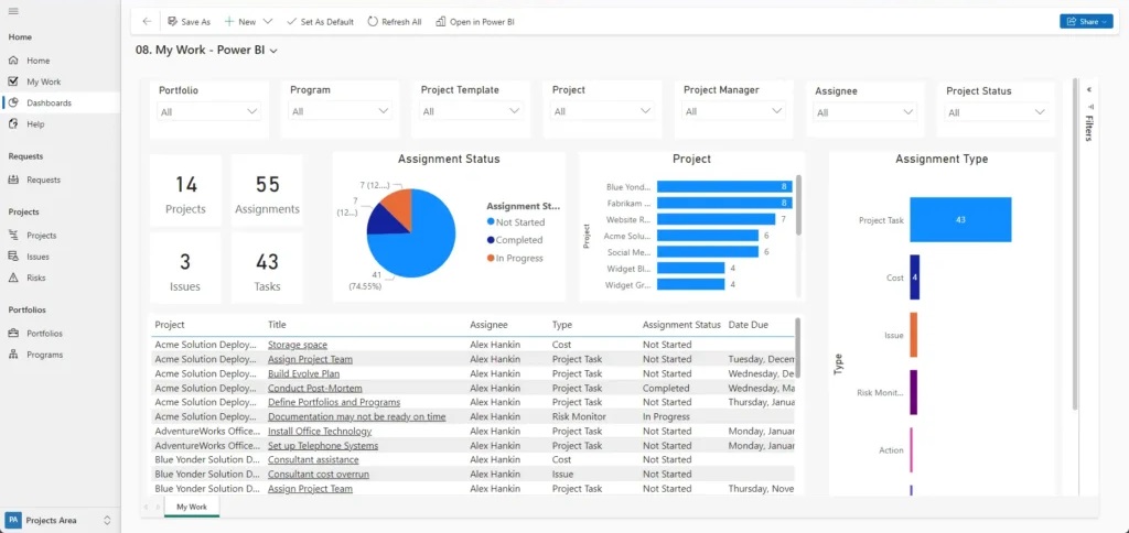 - داشبوردهای راهبردی برای مدیران ارشد طراحی میشوند و بینشهای خلاصهای درباره سبد پروژهها ارائه میدهند که با اهداف کلان سازمان و بازگشت سرمایه همسو هستند.