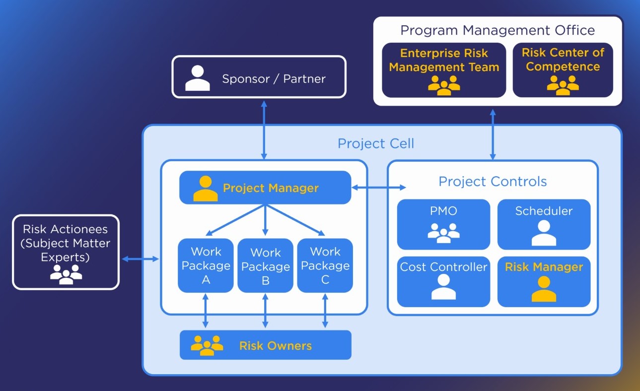 مدیر پروژه با مدیر ریسک همکاری نزدیکی دارد و انتظارات پروژه را تعیین میکند. او پیشنهادهای مدیر ریسک در مورد فرایندها و وضعیت ریسکها را تایید میکند و باید دید کلی از ریسکها و فرصتهای پروژه داشته باشد. وظایف مدیر پروژه شامل موارد زیر است: