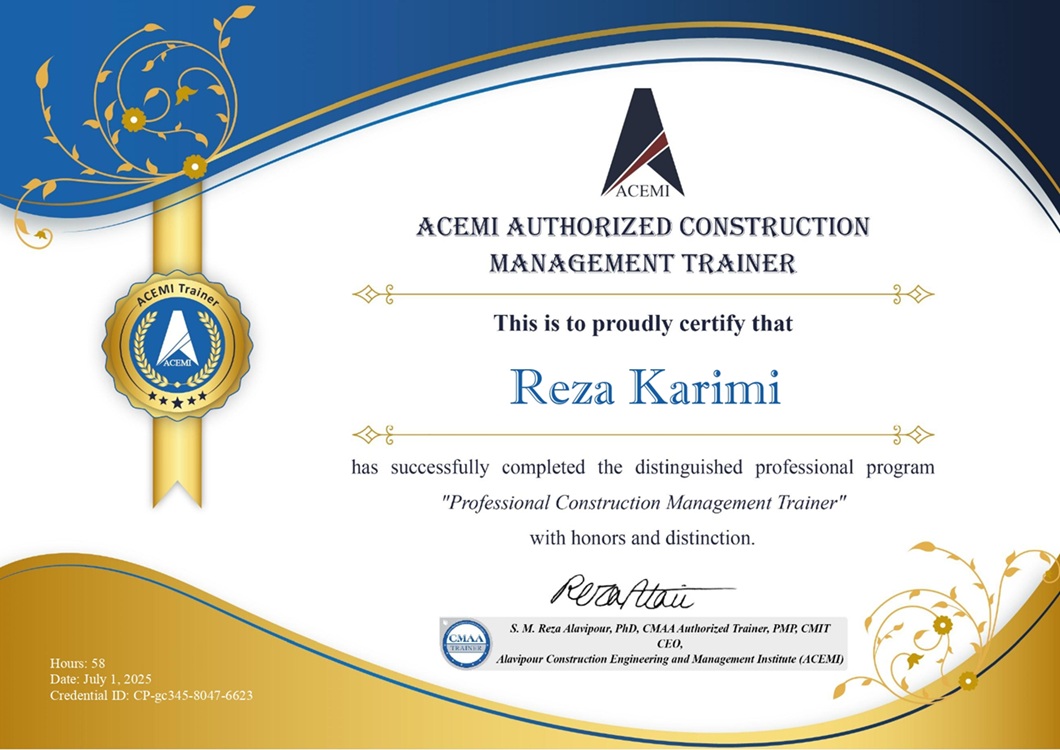 گواهینامه مدرس حرفهای مدیریت پروژه در صنعت ساخت | ACEMI Authorized Trainer Certification | آبی - طلایی | دورههای مدرس حرفهای مدیریت پروژه در صنعت ساخت | تایید نهایی اساتید |