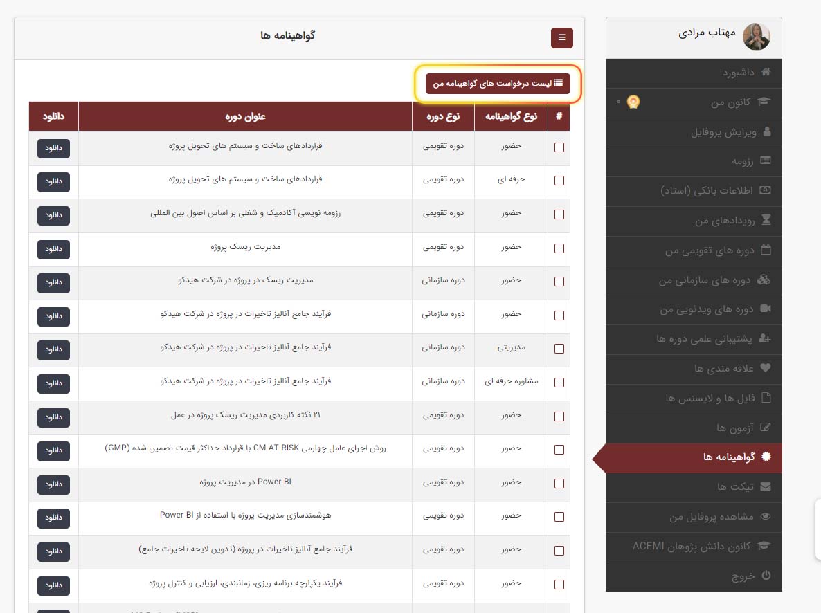 1. برای دسترسی به گواهینامه ها ابتدا میبایست وارد پنل کاربری خود شوید. از منوی سمت راست گواهینامهها را انتخاب کنید. در این صفحه تمامی گواهینامه هایی که دریافت کرده اید، درج شده است.