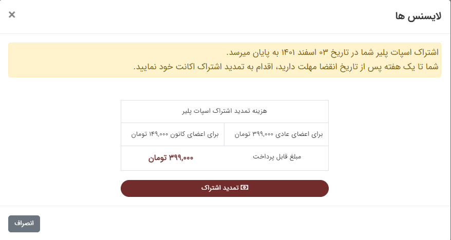 هزینه تمدید لایسنس بر اساس تعرفههای اسپات پلیر و هزینه فضای ذخیرهسازی فایلها محاسبه میشود و اعضای کانون دانشپژوهان برای تمدید لایسنسهای خود از تخفیف برخوردار میشوند و هزینه کمتری میپردازند.