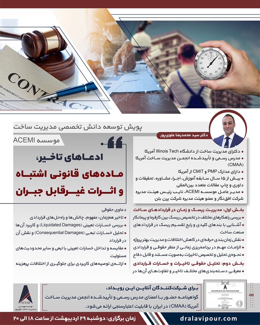 این جلسه تخصصی فرصتی است برای کسانی که میخواهند از حاشیهی صرفا اجرایی فراتر رفته و وارد لایههای عمیقتر مدیریتی و تصمیمسازی شوند. در این جلسه، با بهرهگیری از تجربیات شرکتهای بینالمللی، به بررسی مفاهیم کلیدی در زمینه ادعاهای تاخیر، اشتباهات رایج در مفاد قراردادی و تاثیرات غیرقابل جبران آنها میپردازیم. آموختن این مفاهیم، نهتنها مانع از بروز دعاوی پرهزینه میشود، بلکه گامی مؤثر در جهت ارتقاء جایگاه حرفهای شما در صنعت ساخت خواهد بود.
