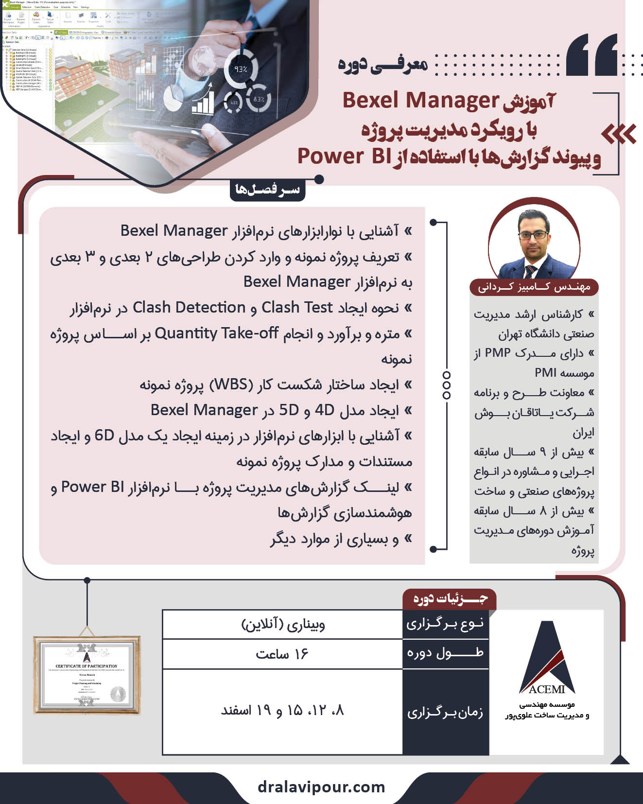 فرصت فراگیری دانش تخصصی و عملی خصوصا در بعد ششم مدل سازی اطلاعات ساختمان (BIM) و قابل اجرا با نرم افزار Bexel Manager ، موقعیتی عالی برای علاقه مندان است که توسط موسسه ACEMI و بوسیله جناب مهندس کردانی فراهم شده است. شرکت در این دوره جامع را به علاقه مندان حوزه ساخت و بیم اکیدا پیشنهاد میکنم.