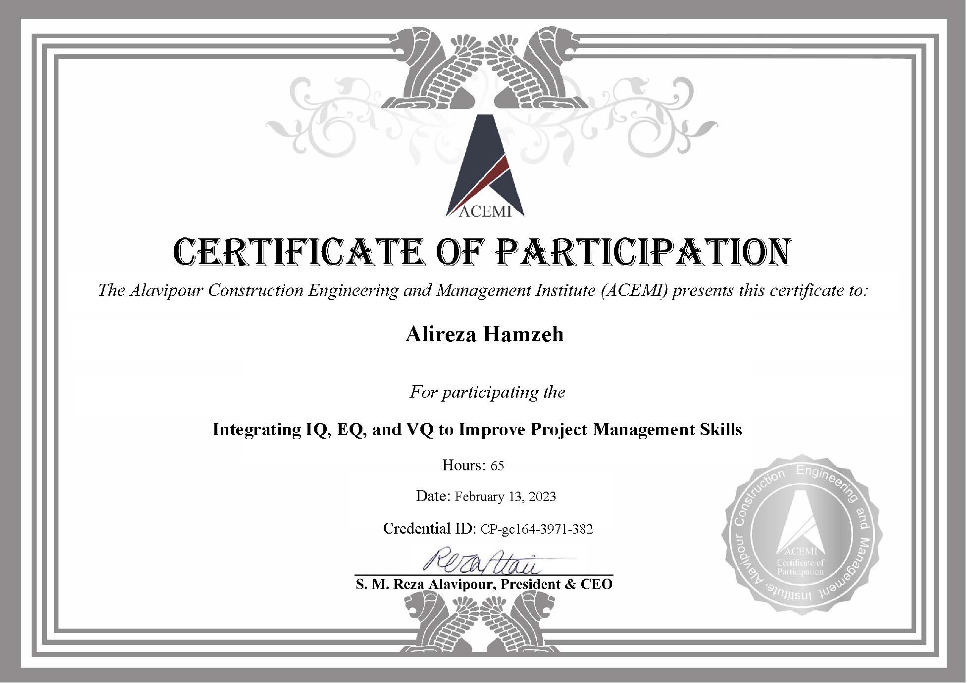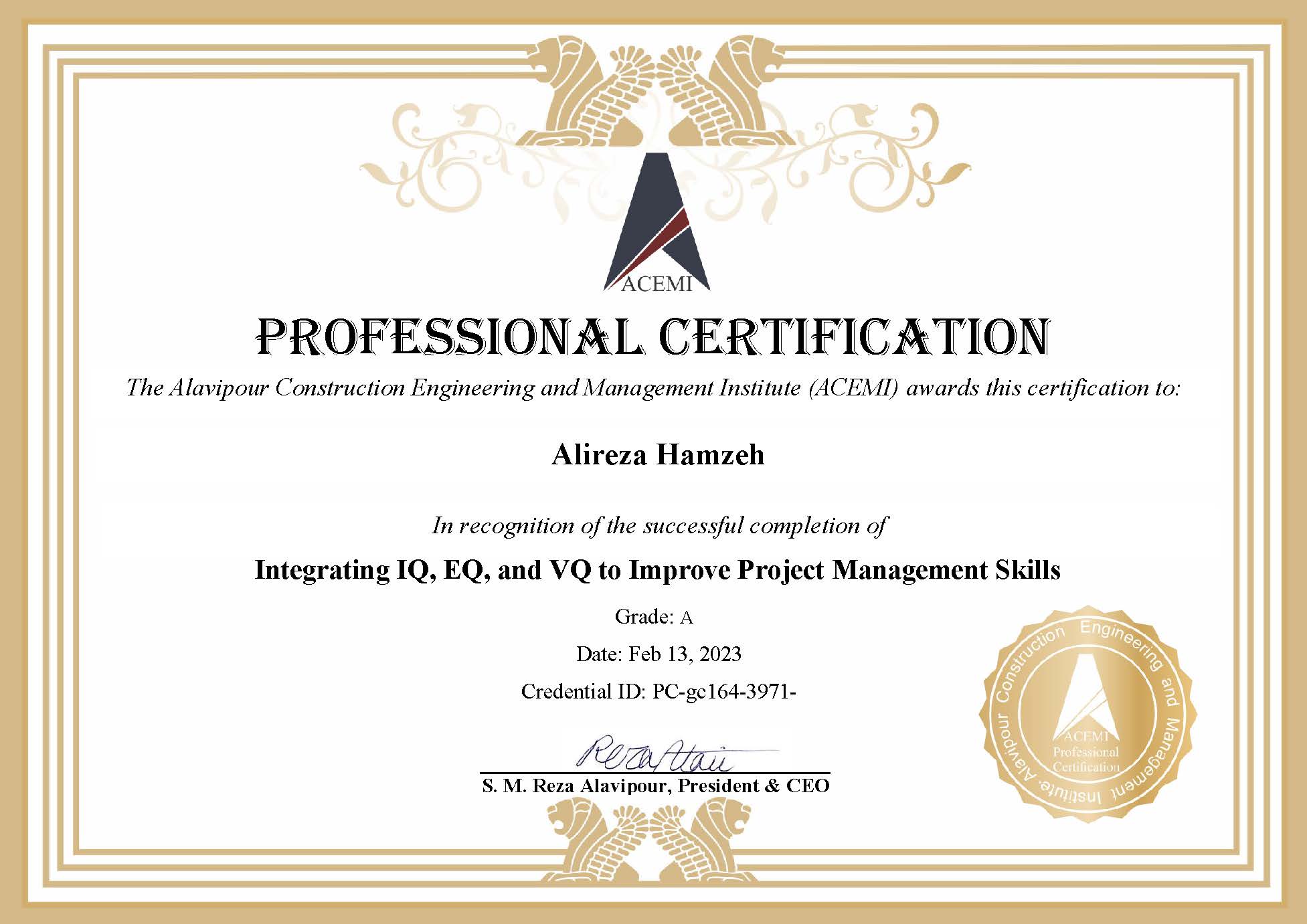 با سلام و خسته نباشید یک تشکر ویژه از دکتر علوی پور بابت برگزاری این دوره بسیار عالی و پر محتوا که با تدریس فوق العاده ای که داشتند و مطالبی که در این دوره ارائه شد به نظرم یکی از بهترین دوره هایی بود که شرکت کردم . دوره ای که در آن مفاهیم ضریب هوشی، هوش هیجانی و هوش ارزشی کاملاً تشریح شده و ارتباط بین آنها و همچنین پیاده سازی در صنعت ساخت به صورت کامل و واضح تدریس شده است که نه تنها در صنعت بلکه خیلی از آموزه های آن را نیز در زندگی روزمره می توان به کار برد. باز هم تشکر میکنم از دکتر علوی پور و موسسه حرفه ای ACEMI