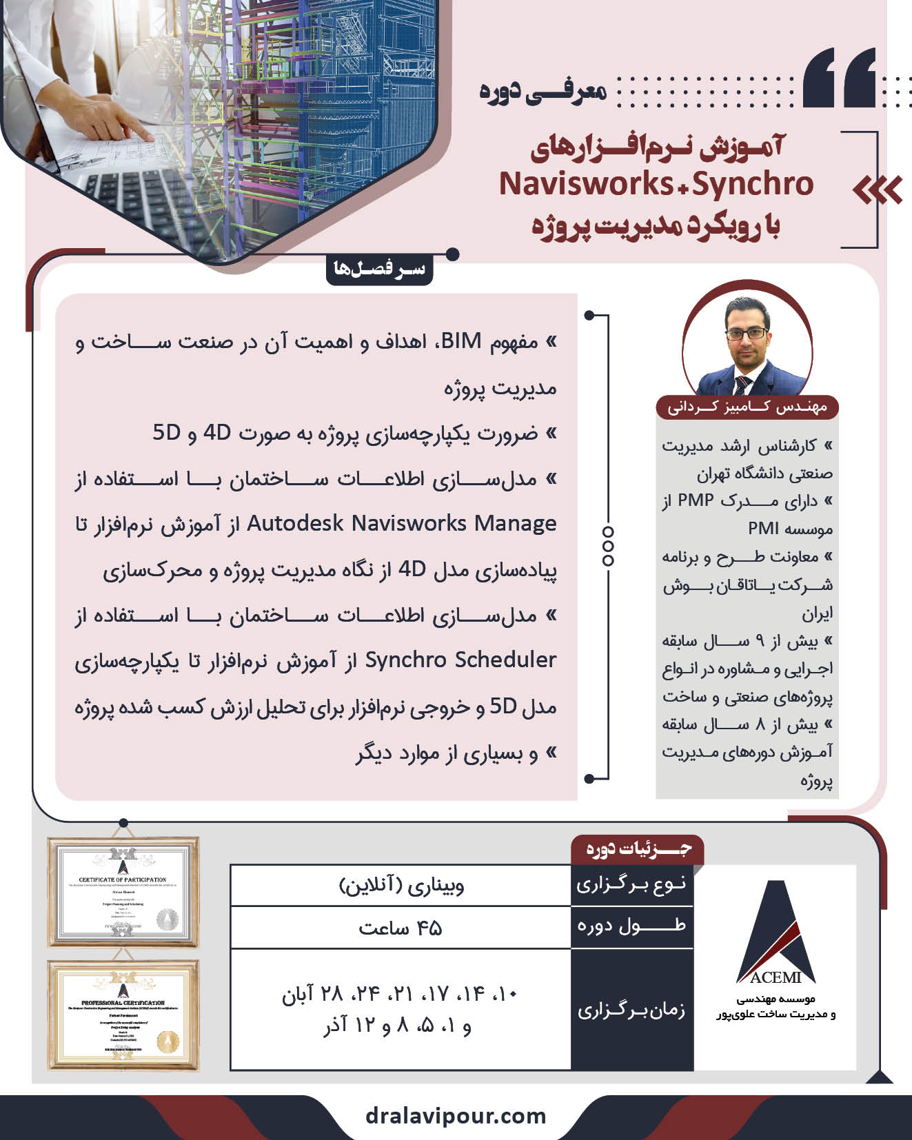 سلام و عرض ادب با توجه به اینکه موضوع پایان نامه ارشد من بیم بود، اگه این دوره رو اون زمان فراگرفته بودم خیلی کمک بیشتری میشد برای مدلسازی پروژه ای که داشتم. سال 96 دوره نویز ورک رو گذرونده بودم اما این دوره تفاوتی که داشت کاملا ساختی بود و با رویکرد پروژه محوری که جناب کردانی عزیز دوره رو تدریس میکردن و یکپارچگی که دوره داشت با مباحث زمانی و مالی خیلی جذاب بود و وجه تمایز این دوره رویکرد اجرایی و کاربردی این نرم افزارها در پروژه ها بود که حداقل من هنوز در شهر خودمون ندیدم. ممنون از موسسه وزین ACEMI.