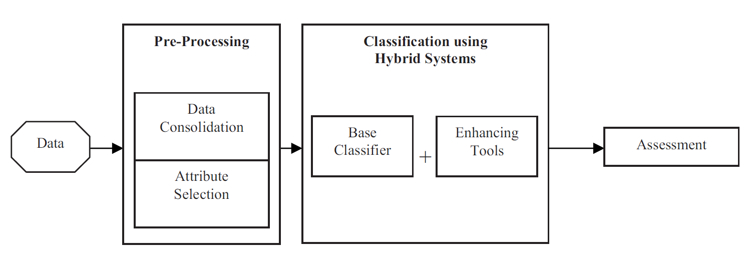 در مرحله بعد، طبقهبندی بر اساس یک سیستم هیبریدی یا ترکیبی انجام میشود (Classification Using Hybrid Systems). مدل معرفی شده در این بخش، از یک طبقهبندیکننده پایه (Base Classifier) و ابزارهای بهبوددهنده (Enhancing Tools) تشکیل شده است. طبقهبندیکنندههای پایه شامل موارد زیر هستند: