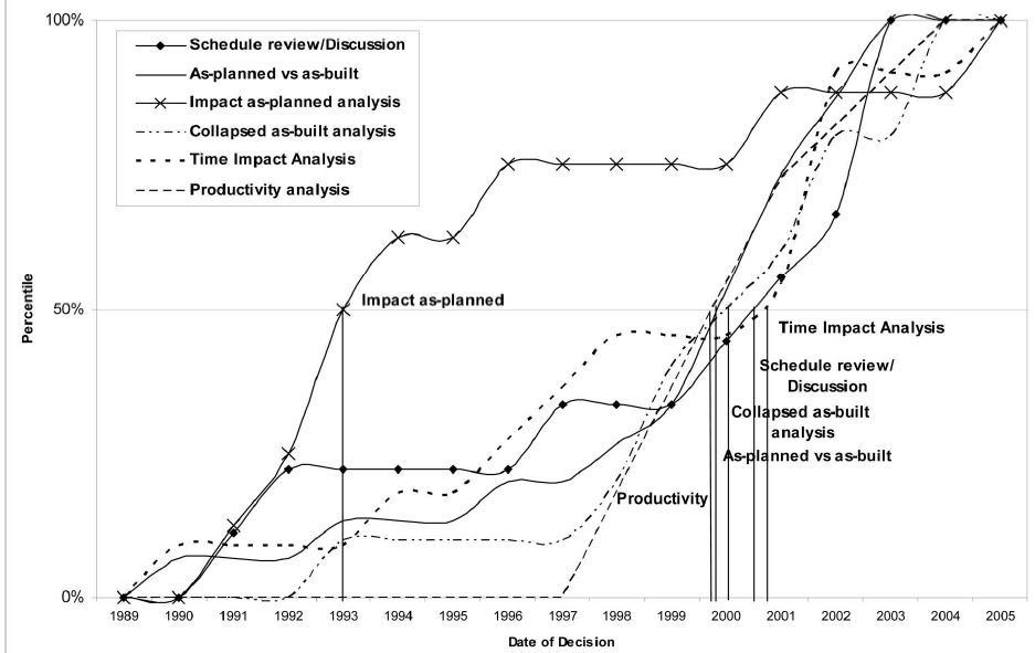روشهایی که دارای پیچیدگی کمتری بودند (مانند روشهای 1 و 2) در پروژه های کوچکتر با پیچیدگیهای کمتر استفاده شدهاند. در مقایسه انجام شده در مطالعه معرفی شده، روش 2 در 58 مورد بیشترین انتخاب را داشته است و این موضوع به دلیل ساده بودن این روش اتفاق افتاده است. اما باید اشاره نمود که این روشها از سوی دادگاهها و هیئتهای داوری به رسمیت شناخته نگردیده (به صورت Total Impact) و در 58 مورد در نظر گرفته شده در این مطالعه توسط ادعا کنندگان استفاده چندانی از آنها در دادگاهها نشده است. روش آنالیز Impacted As-Planned نیز به علت دقت پایین نتوانسته نظر داوران و دادگاهها را جلب نموده و به همین دلیل استفاده از آن در طی سالیان رو به کاهش بوده است.