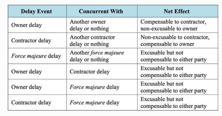 ضوابط قانونی در کشورهای مختلف در خصوص نحوه برخورد با مسئولیتها و خسارتهای ناشی از تاخیرات همزمان متفاوت هستند. ضوابط رایج در مورد تمدید زمان و حق دریافت جبران خسارت در جدول 2 خلاصه شده است.
