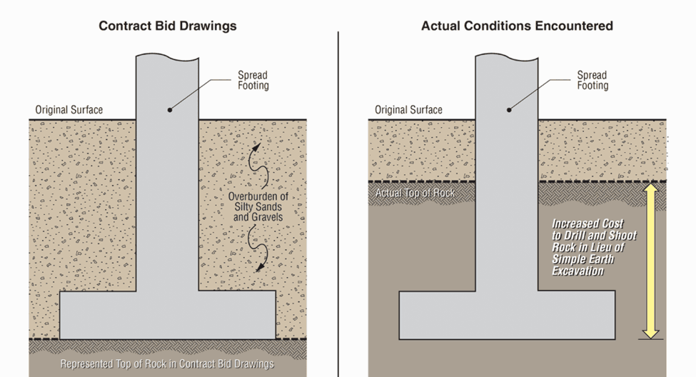 تفاوت در شرایط فیزیکی کارگاه بهطورکلی به شرایطی اطلاق میشود که در آن شرایط فیزیکی واقعی (زیرسطحی یا نهان) که در محل با آن مواجه میشویم، به طور چشمگیری با شرایطی که در اسناد قرارداد ذکر شدهاند، تفاوت دارند (برای مثال به شکل 1 مراجعه شود).