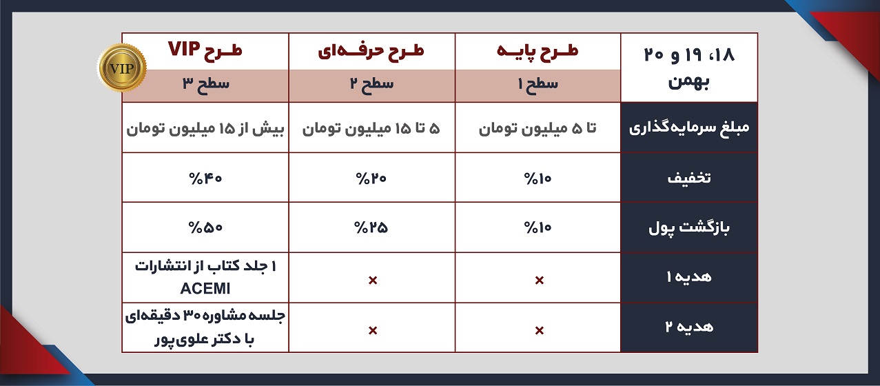 این موارد در حالی است که در طرح VIP یک جلد کتاب هم از انتشارات تخصصی ACEMI هدیه میگیرید و یک جلسه مشاوره 30 دقیقهای با دکتر علویپور، تنها مدرس مرجع و دارای صلاحیت از انجمن مدیریت ساخت آمریکا (CMAA) در ایران و خاورمیانه خواهید داشت.