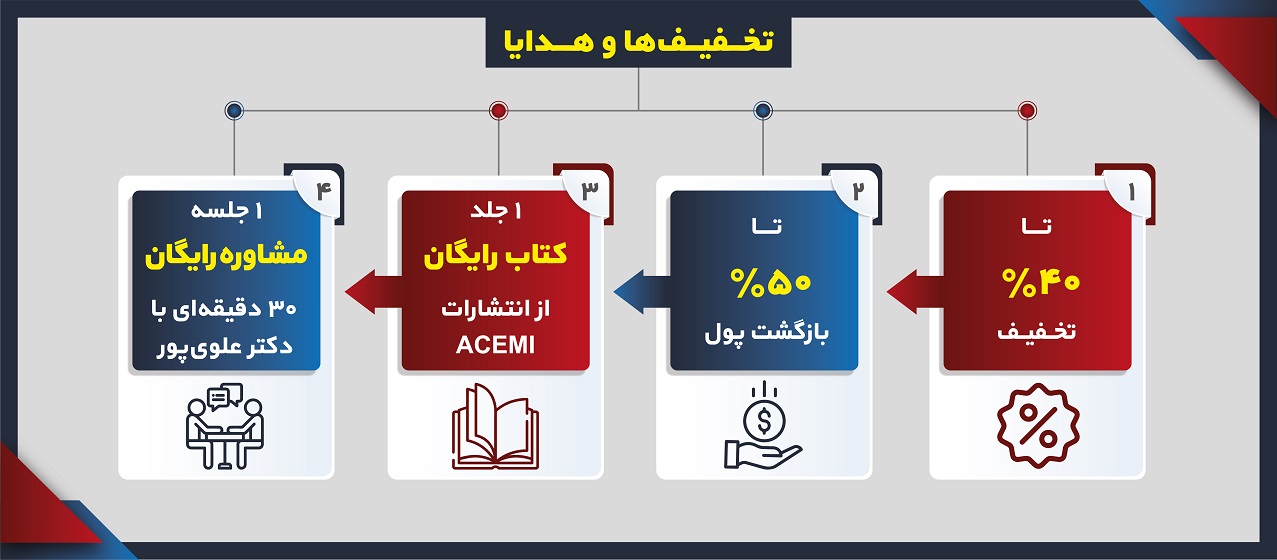 بر اساس خدمات انتخابی خود، میتوانید از تخفیفهای ویژه استفاده کنید. 🎁بعد از خرید دورههای آموزشی موسسه، یک کد تخفیف به میزان 10 درصد مبلغ پرداختی به صورت اتوماتیک دریافت میکنید که میتوانید برای دورههای بعدی به مدت 14 روز استفاده کنید. 🔑طبیعتاً عضویت در کانون، انتخاب هوشمندانهتری است، چون هم تخفیف بیشتری دارد و هم به مزایای تکمیلی دسترسی پیدا میکنید. | با تهیه دورههای آموزشی به ویدئوهای دورهها که با کیفیت بالا ضبط شدهاند، از طریق لایسنس اسپات پلیر دسترسی پیدا میکنید. برای اطلاعات بیشتر راهنمای دسترسی به محتواها را مطالعه کنید. | - اگر عضو کانون دانشپژوهان باشید میتوانید جزوات و فایلهای دوره را از پنل کاربری دانلود کنید. - اگر عضو عادی باشید تنها به فایلهای ضمیمه دوره میتوانید دسترسی داشته باشید. 🔑عضویت در کانون هم از نظر اقتصادی و هم از نظردسترسیها برای شما بهصرفه است. | میتوانید در این طرح هم نسخه چاپی و هم الکترونیکی را تهیه کنید. انتخاب هر دو نسخه قطعا انتخاب هوشمندانهتری است زیرا مزیت اقتصادی فراوانی دارد. |