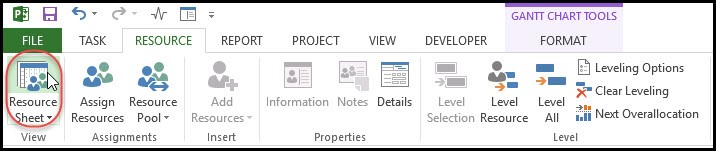 شکل ۲. دسترسی به Resource Sheet از تب Resource برای تعریف مصالح پروژه.