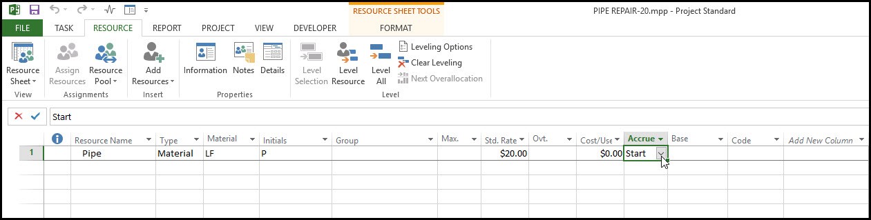 همچنین ستون Accrue برای منبع ذکر شده روی حالت Start تنظیم شده به این معنا که هزینه این منبع در ابتدای فعالیت تخصیص یافته است. سایر گزینهها شامل End و Prorated که بسته به زمان تخصیص هزینهها اعمال میگردند.