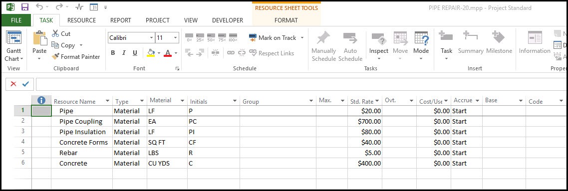 در Resource Sheet، یک منبع به نام لوله (Pipe) تعریف شده و نوع آن مصالح یا Material تعیین میگردد.