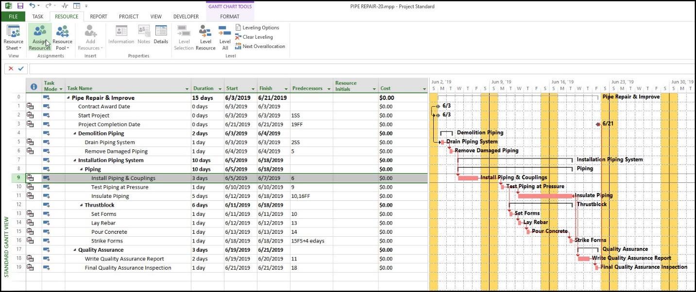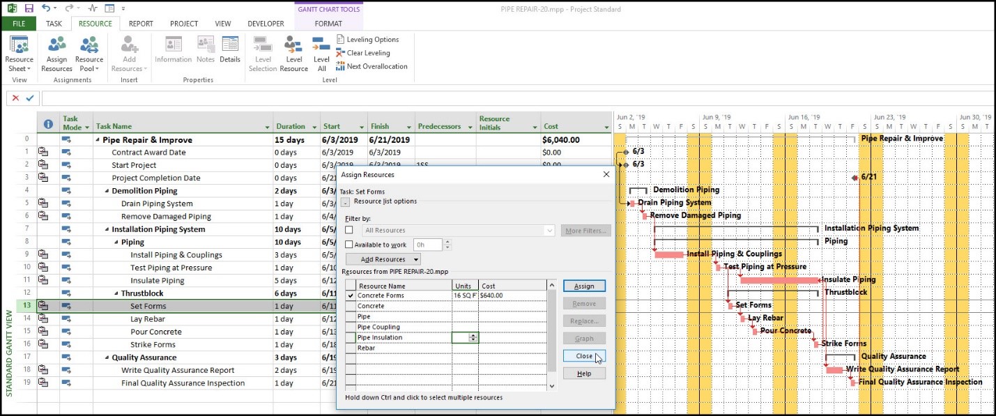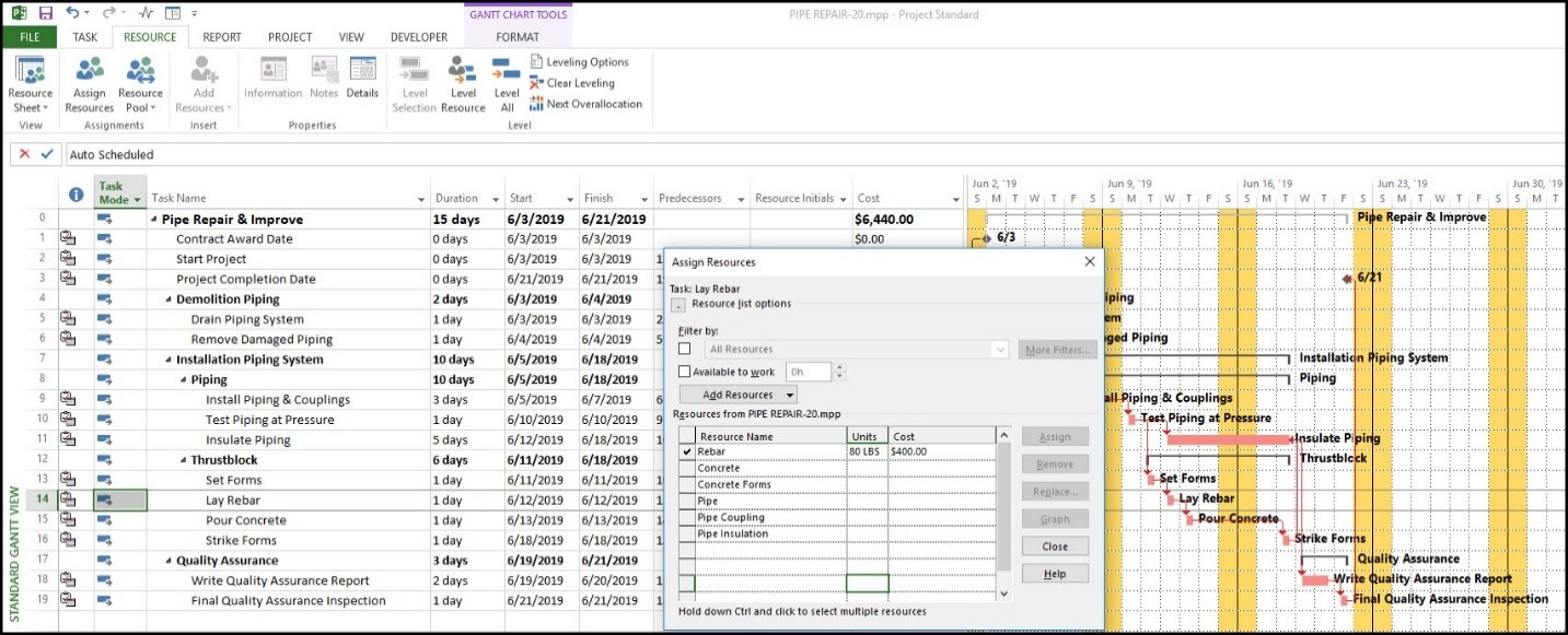 شکل ۶. انتخاب گزینه Assign Resources از تب Resource برای تخصیص مصالح به فعالیت نصب لوله و اتصالات.