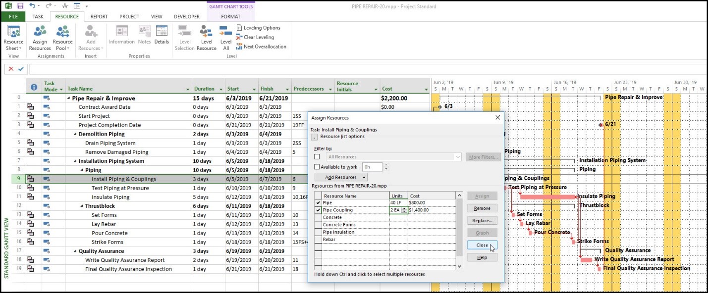 در پنجره Assign Resources، مقدار 40 فوت از منبع لوله و 2 عدد از منبع اتصالات لوله به فعالیت نصب لوله و اتصالات تخصیص میگردد و هزینههای مرتبط نمایش داده میشود.