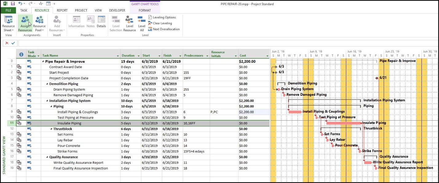 پس از تعریف مصالح، فعالیت نصب لوله و اتصالات انتخاب شده و از تب Resource، بخش Assignments گزینه Assign Resources انتخاب میگردد.
