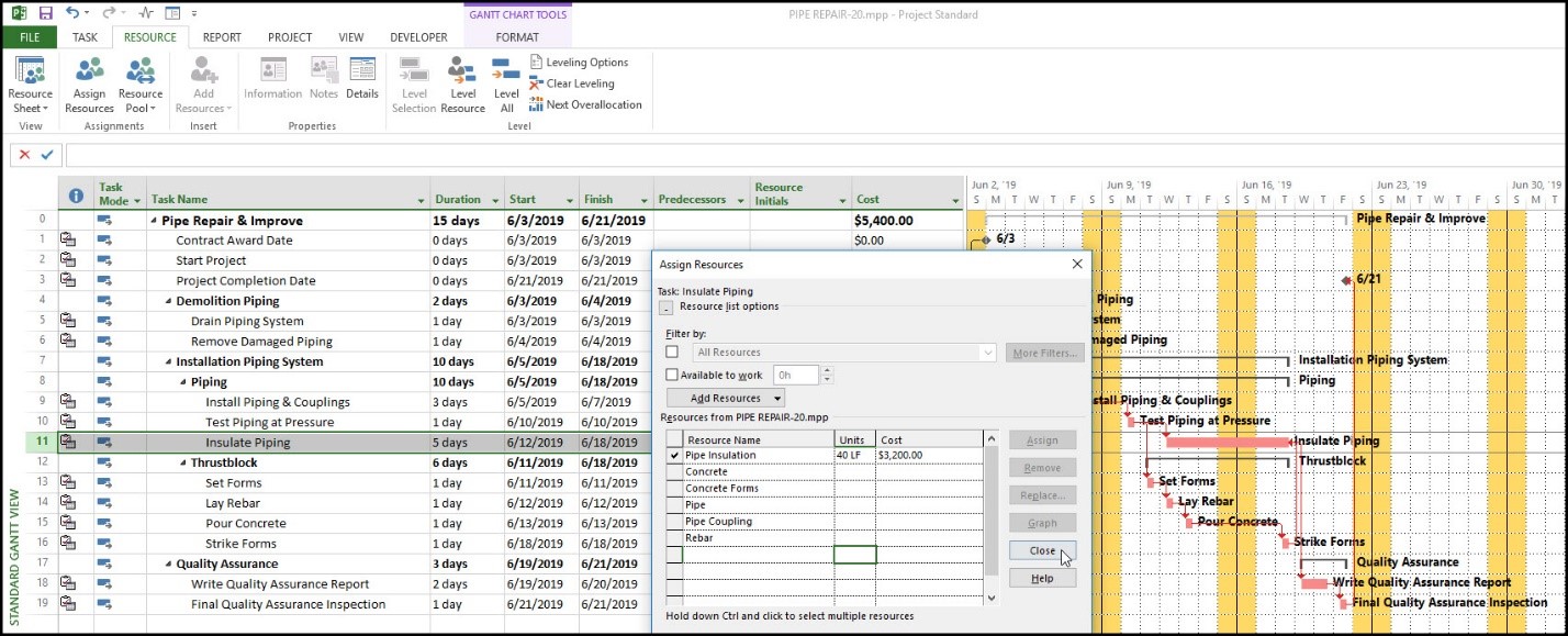 به فعالیت عایقبندی لوله، مقدار ۴۰ فوت از منبع عایق لوله تخصیص داده شده تا با طول ۴۰ فوت طول لوله مطابقت داشته باشد. هزینه این مصالح در پنجره Assign Resources نمایش داده میشود.