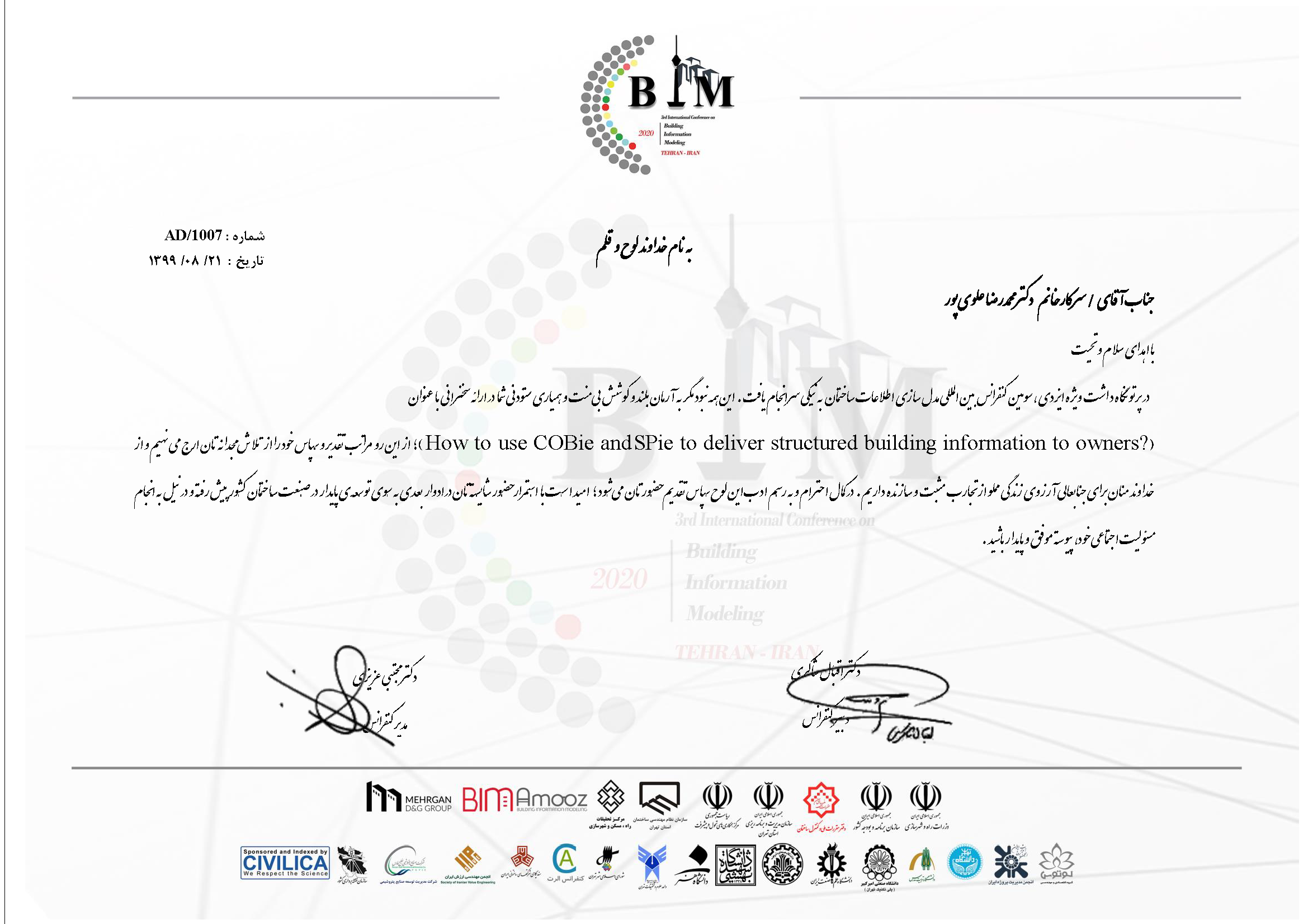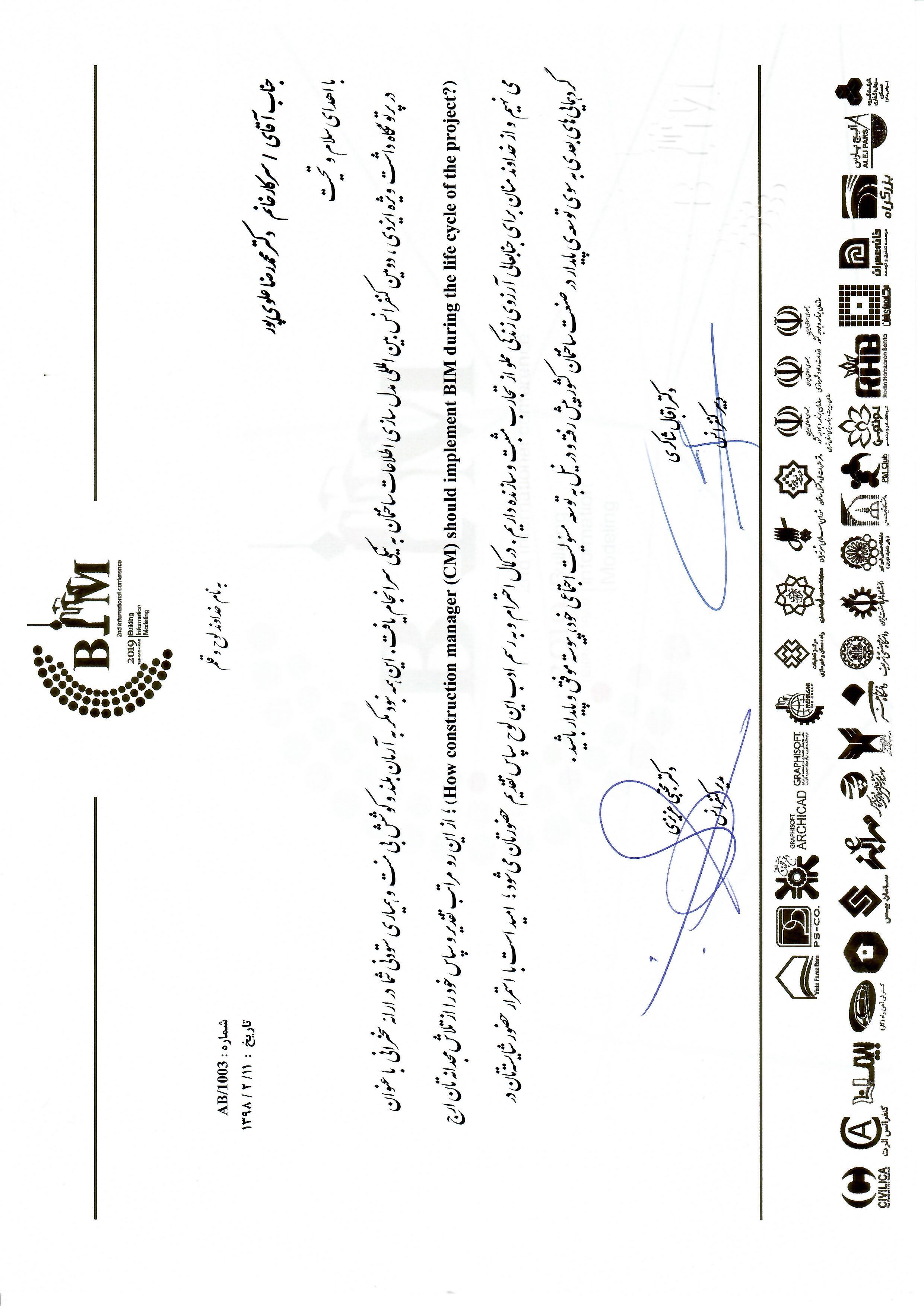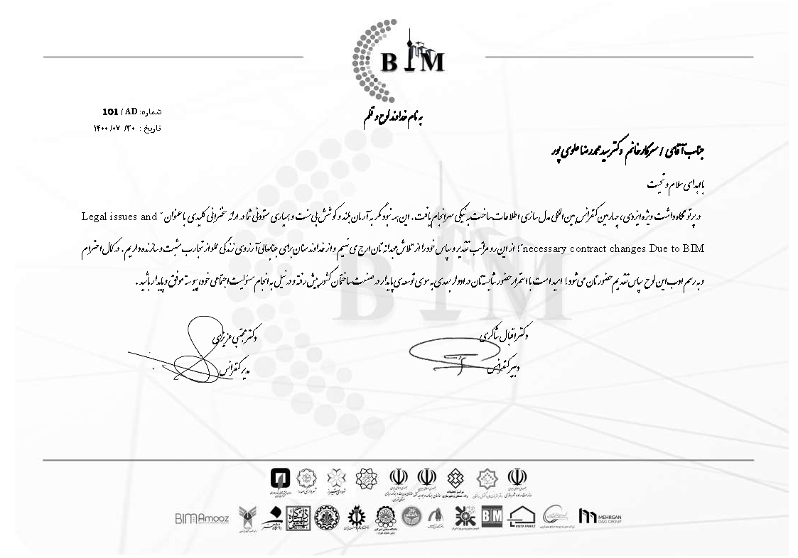 کنفرانسهای دوم و سوم و چهارم در سالهای 1398، 1399 و 1400 برگزار گردید. هر چند هنوز موضوع بیم (مدلسازی اطلاعات ساختمان) در کشورمان نیاز به مطالعه، بررسی و فعالیت بیشتری دارد، اما این کنفرانسها میتواند نتایج مناسبی را برای رشد این عرصه ایفا نماید. دکتر علوی پور نیز در این کنفرانس سخنرانی درباره وظایف مدیر ساخت (construction manager) و نحوه پیاده سازیBIM در طول چرخه حیات پروژه توسط CM صحبت نمودند که بازخوردهای بسیار مناسبی از این سخنرانی بدست آمد.
