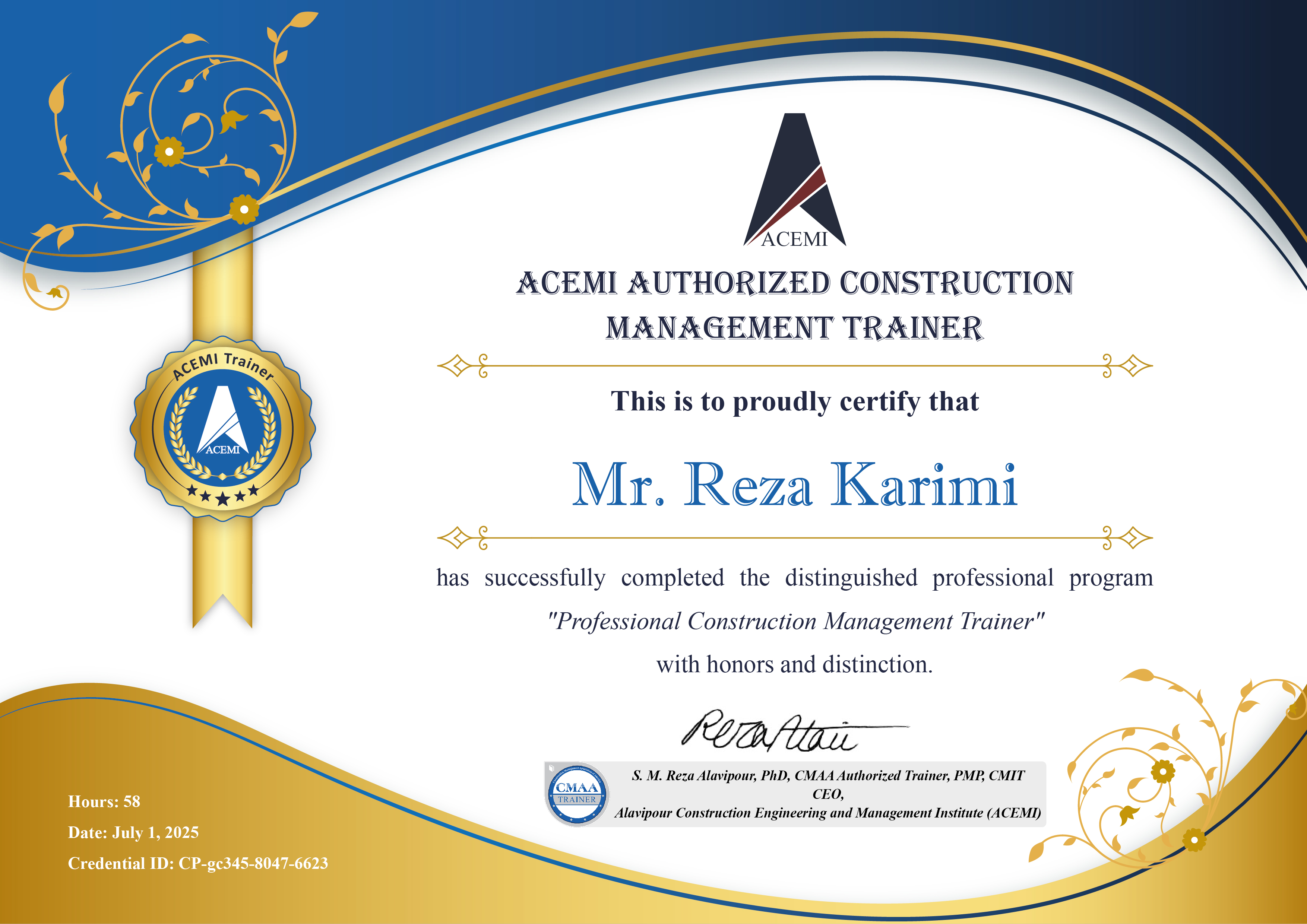 این دوره با تدریس و راهبری دکتر سیدمحمدرضا علویپور (تنها مدرس دارای صلاحیت از انجمن مدیریت ساخت آمریکا (CMAA) در ایران و خاورمیانه) و مهندس نریمان درافشان (با مهارت تسهلیگری حرفهای اسکرام) برگزار میشود و در پایان به افراد واجد شرایط، گواهی معتبر ACEMI Authorized Construction Management Trainer (AACMT) اعطا خواهد شد.